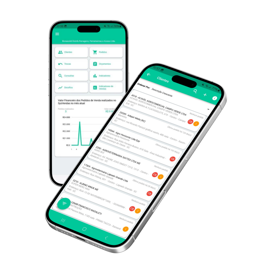 A solução móvel integrada ao SIA ERP foi desenvolvida para atender de forma completa aos processos operacionais, gerenciais e legais da área de vendas. Com recursos avançados de controle e integração, ela permite o registro de pedidos, orçamentos e informações comerciais com agilidade, precisão e conformidade, garantindo maior eficiência e confiabilidade nas operações.